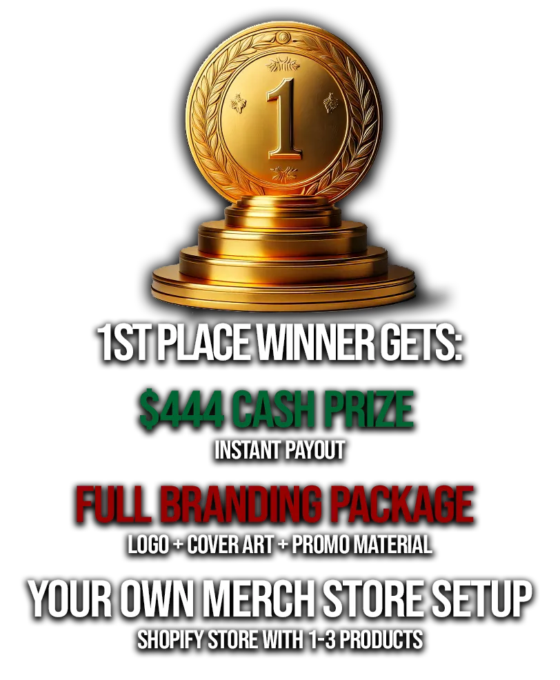 Cash prizes will be sent via PayPal, Cash App, or direct deposit. Branding packages & merch store setup will begin immediately after winner confirmation.